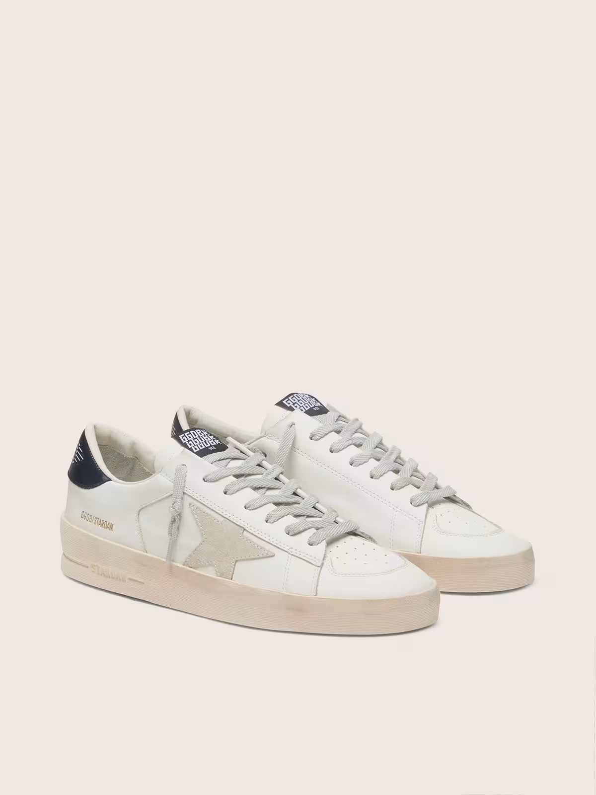 Sneakers Golden Goose modello Stardan in pelle bianca con dettagli blu, espressione autentica dello stile vintage del brand. La tomaia in pelle liscia è arricchita dall’iconica stella laterale e dal tallone a contrasto, mentre il trattamento distressed dona a ogni paio un carattere unico e vissuto.