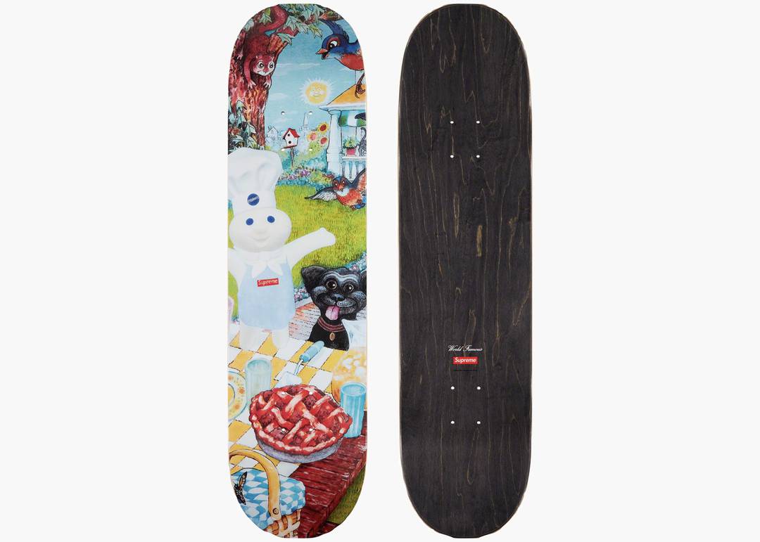 La tavola da skate Supreme Doughboy Skateboard Deck Picnic è un'edizione esclusiva della collezione Supreme, con un design che si distingue per la sua grafica accattivante. La tavola presenta una impiallacciatura naturale e un strato superiore nero, mentre la parte inferiore è decorata con una grafica che presenta il famoso Doughboy, un'iconica figura del marchio Supreme, abbinata al testo "World Famous". Il classico box logo Supreme si trova sulla parte superiore, aggiungendo l'elemento distintivo del brand che rende ogni prodotto riconoscibile in tutto il mondo.